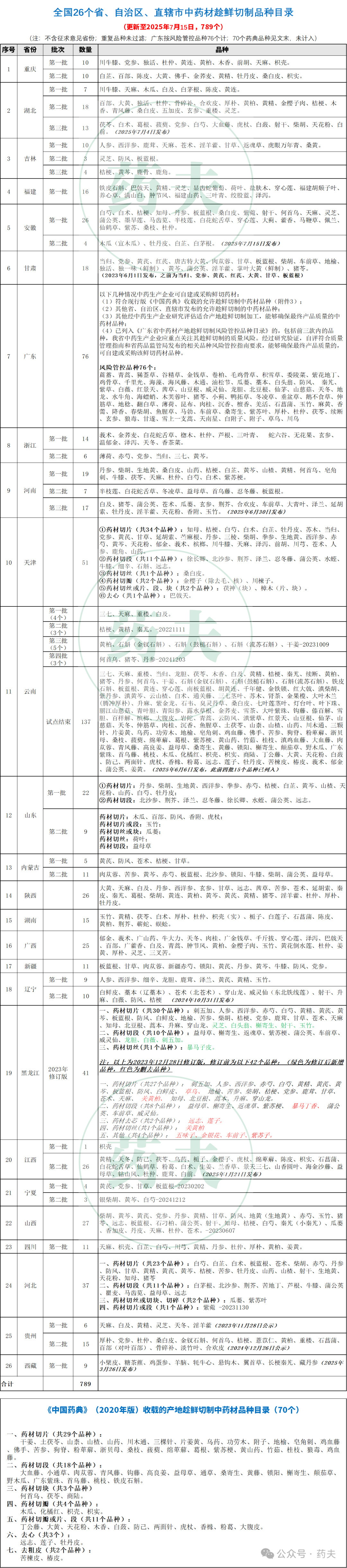 截至2025年7月15日,全国已有26个省、自治区、直辖市先后发布了中材产地趁鲜切制加工品种目录,共收录中药材品种789个(含重复品种):